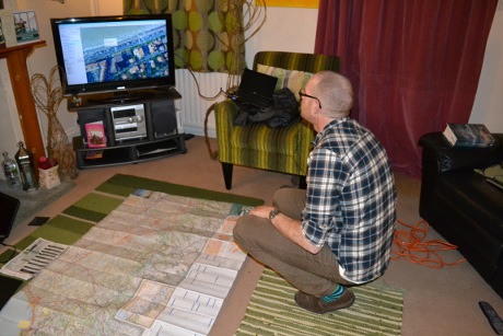 Paper maps on the floor and Google Earth on the HD TV :-D